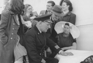 ‘Captain G. Visser of the ship Kota Inten, shows a family of the Dutch province zeeland the sailing route to their new country Canada’, from Utrechts Nieuwsblad 1948. Zeeuwse Bibliotheek through Europeana.