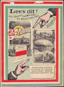 Emigration was stimulated by the government in the post-war Netherlands and was also encouraged in the settlement countries. Here is a poster promoting the best wheat soil and pasture in the world in Manitoba (Canada). Circa 1890, through Library and Archives Canada.