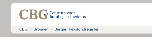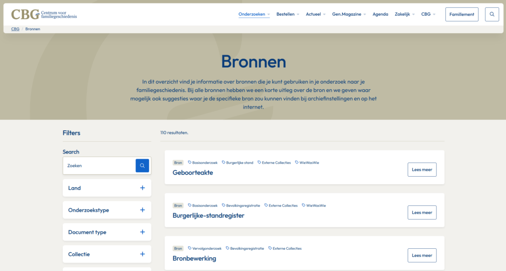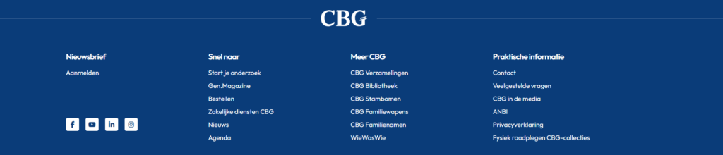 ‘CBG.nl is het knooppunt van alle genealogische informatie die het CBG te bieden heeft en meer. Zo is WieWasWie de databank waarin bronnen uit heel Nederland samenkomen. Op cbgverzamelingen.nl vind je de bronnen die het CBG zelf beheert. Dan zijn er nog cbgfamilienamen.nl en cbgfamiliewapens.nl.