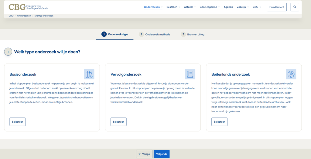 Het oude stappenplan voor het doen van onderzoek voldeed niet in de behoeften van zowel startende als gevorderde onderzoekers. We hebben dit herzien en opgesplitst in drie onderdelen: basisonderzoek (voor startende onderzoekers), vervolgonderzoek (voor het verrijken van de stamboom) en buitenlands onderzoek (voor mensen die voorouders hebben buiten Nederland).