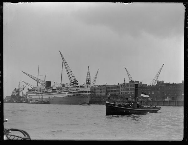 m.s. Dempo van de Koninklijke Rotterdamse Lloyd op de Nieuwe Maas, liggend aan de Lloydkade, ca 1940. François Henry (F.H.) van Dijk. Stadsarchief Rotterdam.