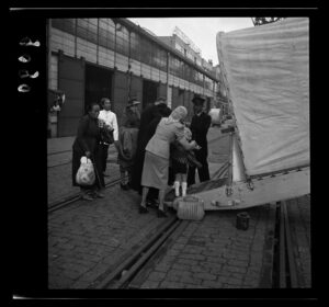 Passagiers van de M.S. Dempo van de Koninklijke Rotterdamse Lloyd gaan aan boord op de Lloydkade, ca. 1937. F.H. van Dijk. Collectie Spaarnestad, Nationaal Archief.