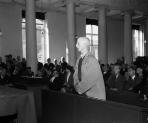 Zitting van het Bijzonder Gerechtshof in Den Haag, 11 september 1945. Max Blokzijl, tijdens de oorlog hoofd van de afdeling Perswezen van het departement van Volksvoorlichting en Kunsten staat hier voor de rechters. Hij werd ter dood veroordeeld vanwege het voeren van propaganda gericht op het breken van het verzet tegen de bezetter. Anefo via Nationaal Archief | Publiek Domein