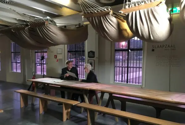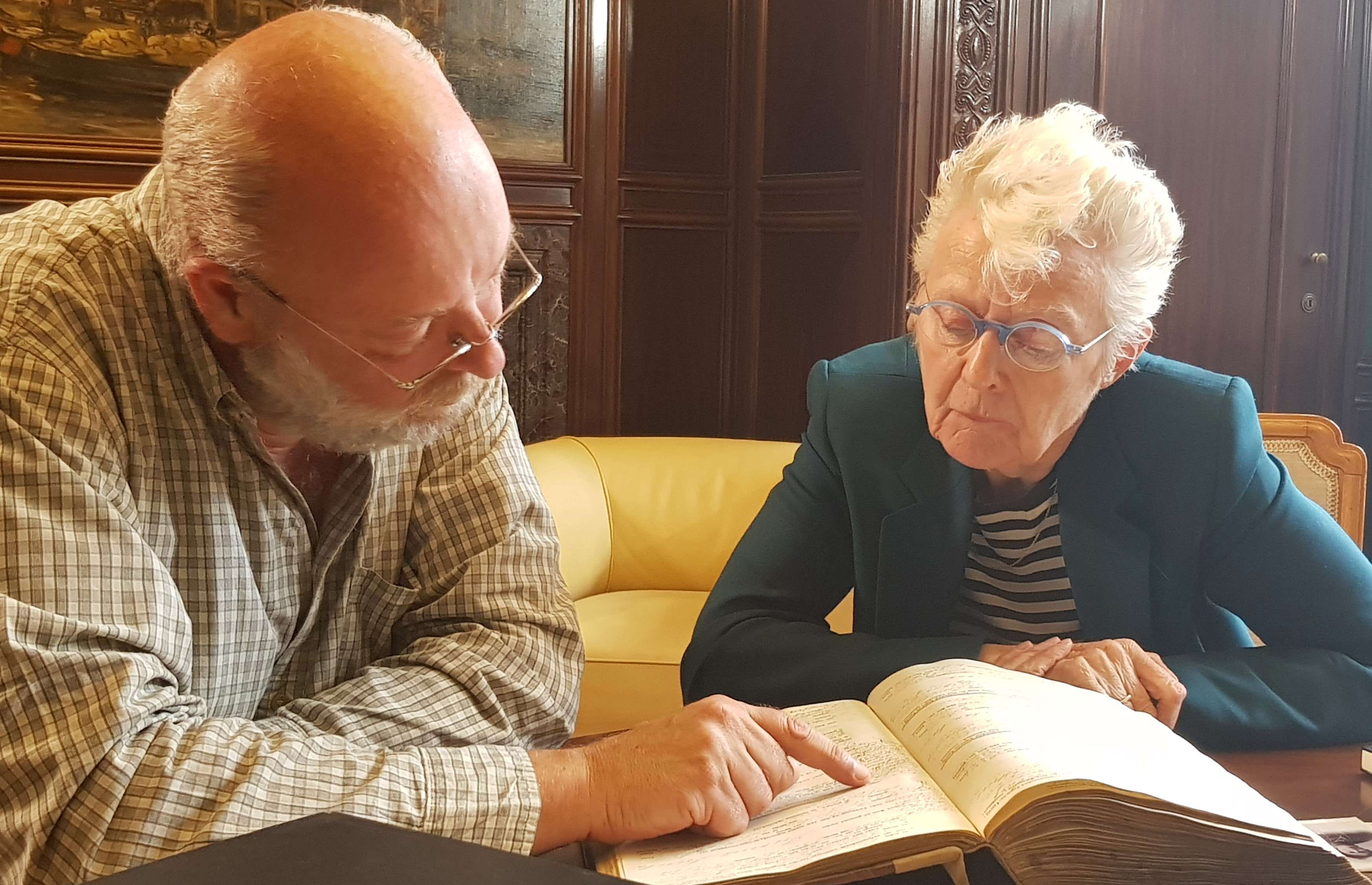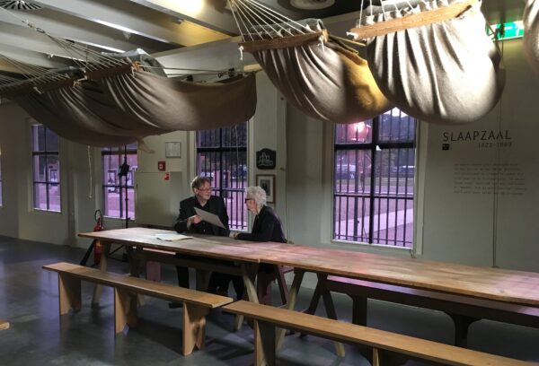 Carry Slee in gesprek met Harmen Snel van het Stadsarchief Amsterdam. Foto: NTR/Blazhoffski