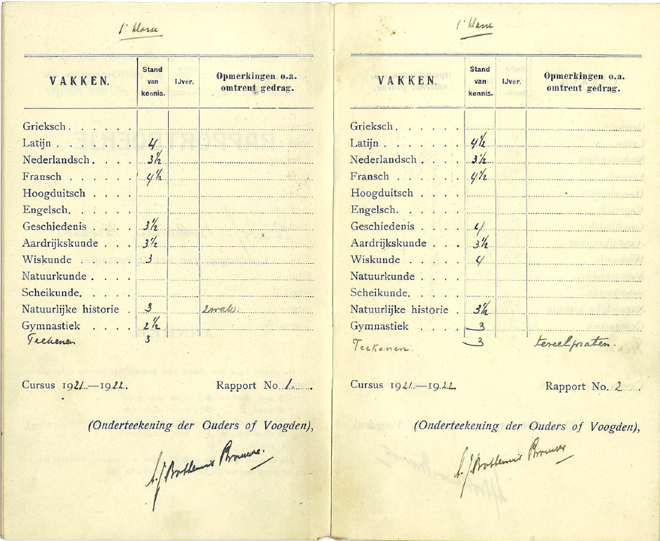 Schoolrapport uit het schooljaar 1921-1922 van Henricus Antonie Jacob Bothenius Brouwer. CBG Verzamelingen.
