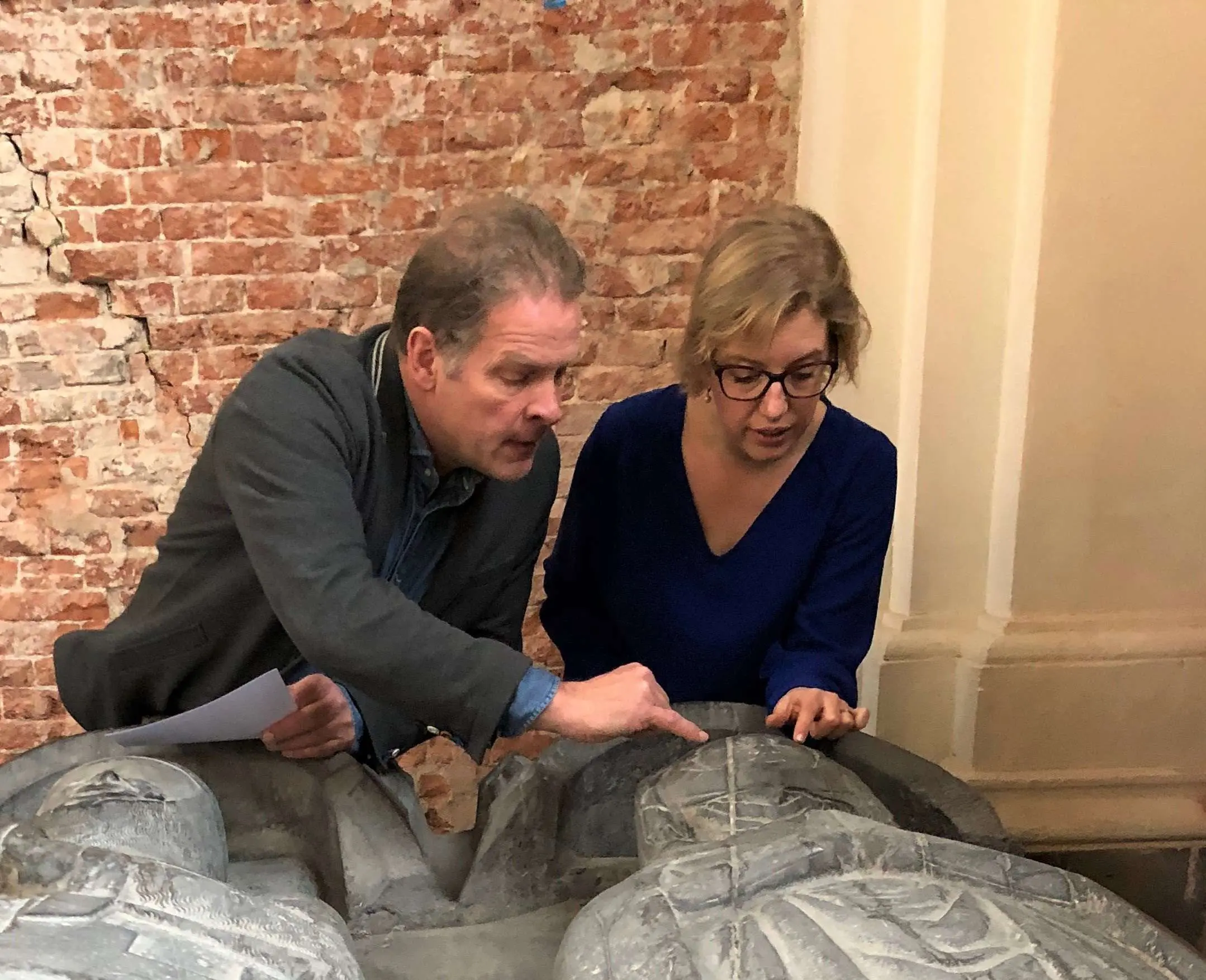 Erik en Sanne Frequin bij de graftombe van een van de Heren van Arkel en zijn vrouw. Foto: NTR/Blazhoffski