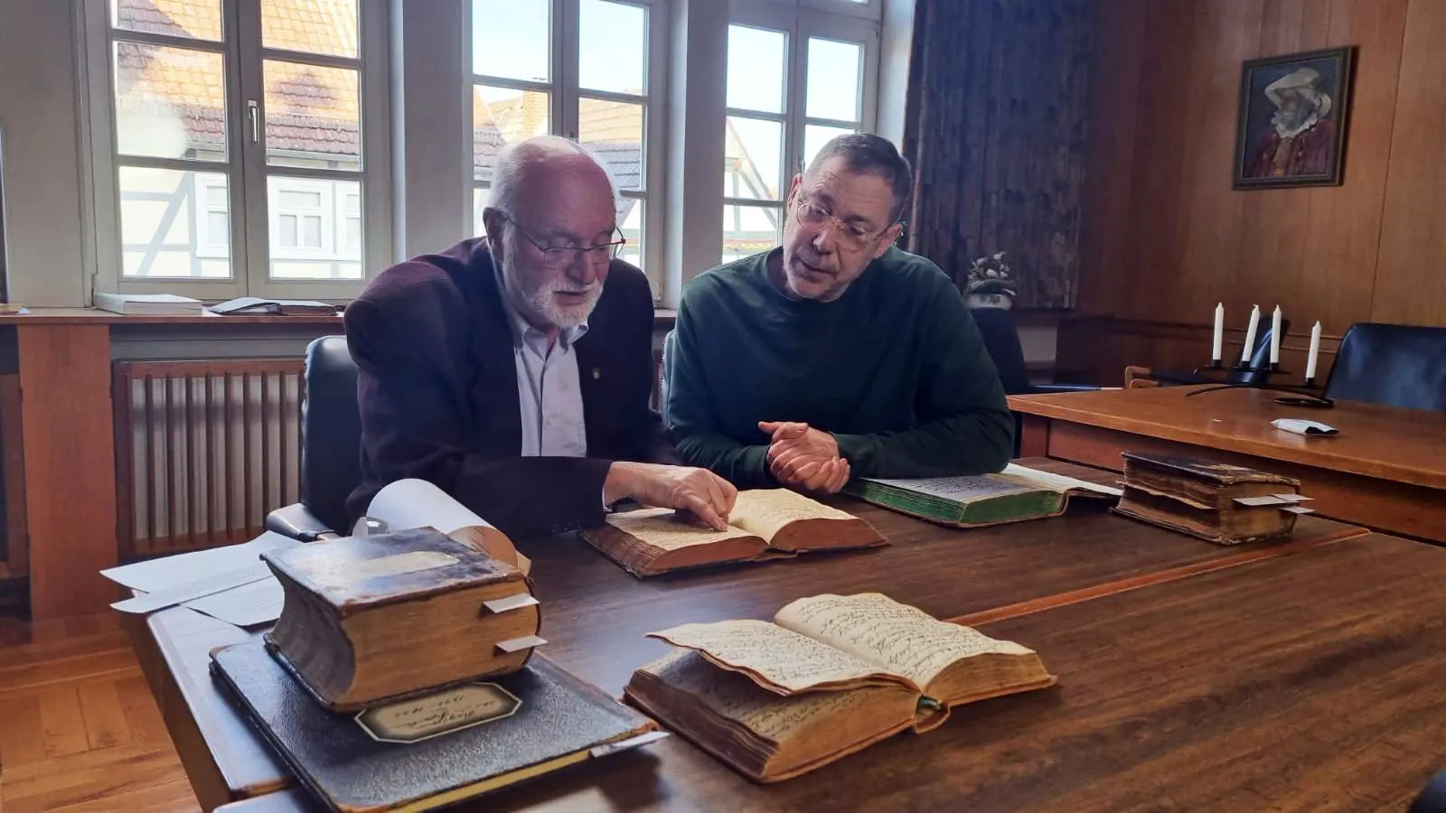 Hans Kesting wordt in Mengeringhausen door Christian Meuser bijgepraat over zijn Duitse voorouders. Foto: NTR/BlazHoffski