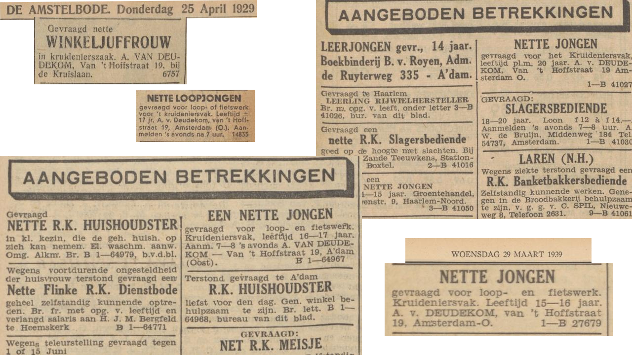 Een aantal oproepen uit verschillende kranten voor personeel van de kruidenierszaak van de voorouders van Joep, fotocollage uit Delpher.